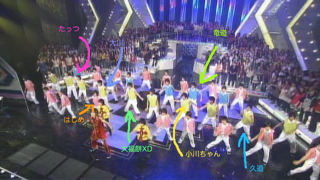 Kishi站在中間,位置真好。旁邊是竜道。要他跳這種舞有點好笑。